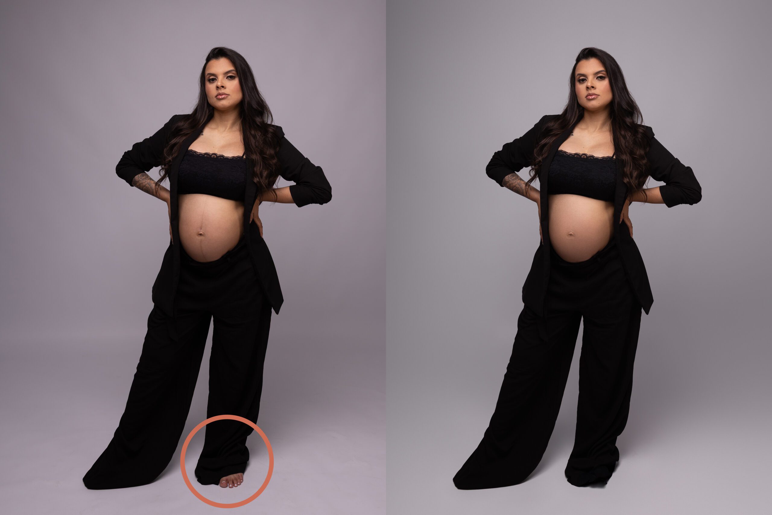 Subtle and natural body shaping for maternity photos using advanced Photoshop liquify techniques to refine proportions, posture, and lines without altering the subject’s natural appearance.